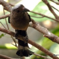 Besar (41 cm.), berbulu kecoklatan dengan tengkuk putih dan ekor bertingkat yang sangat panjang. Tubuh bagian bawah dan punggung berwarna coklat muda; ekor abu-abu dengan ujung kehitaman; tungging dan punggung bawah abu-abu coklat; sayap hitam dengan bercak putih pada pangkal bulu primer.